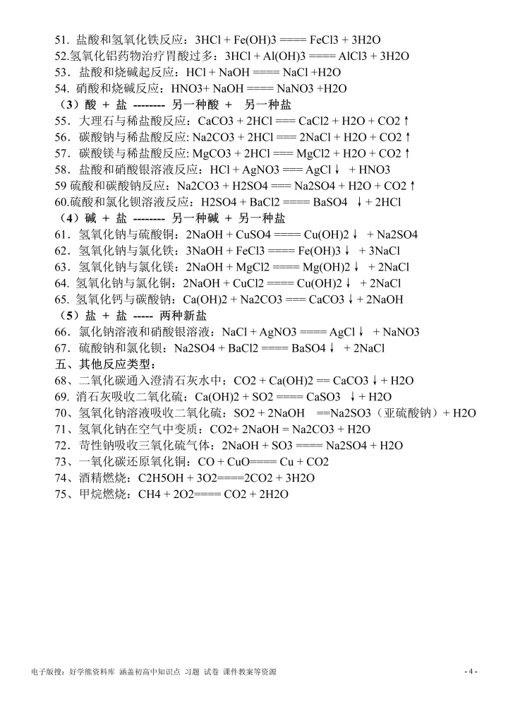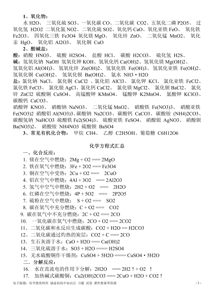 2023年初中化学常用化学式和方程式