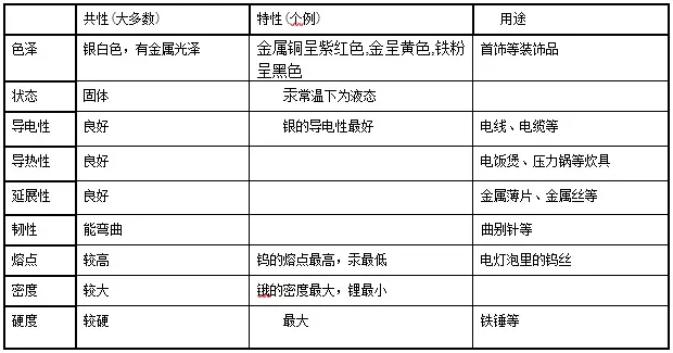 2.一些金属的特性:铁、铝等大多数金属都呈银白色,铜呈紫红色,金呈黄色;常温下大多数金属都是固体,汞却是液体;各种金属的导电性、导热性、密度、熔点、硬度等差异较大;银的导电性和导热性最好,锇的密度最大,锂的密度最小,钨的熔点最高,汞的熔点最低,铬的硬度最大。