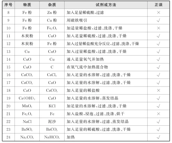 (5)除去Cu中少量的Fe:物理方法——用磁铁反复吸引。化学方法——滴加稀盐酸或稀硫酸,然后过滤。【注意】不能加硫酸铜溶液,否则容易导致除杂不彻底。