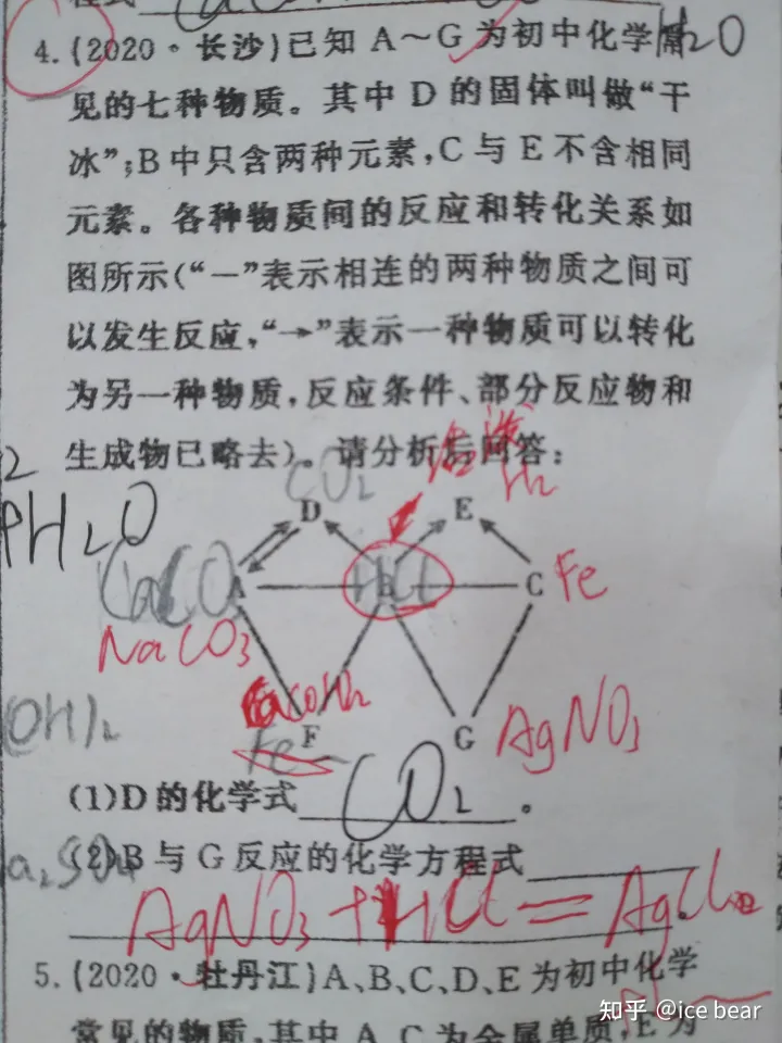 观察图像,What?G不能与F发生反应?甚至不能产生F?联想,根据它们旁边的物质,用最笨的方法依次假设代入推,显然它不是金属,不是金属氧化物,不是酸,只能是盐(别问为什么这时候不用占席位排除,问就是为了简便dog),这个盐中的成分要能与氢氧化钙中的成分结合产生沉淀,选个常见的,就硝酸银吧。