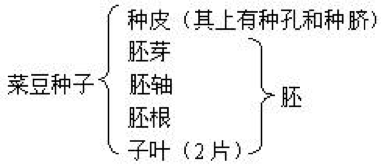 | 菜豆种子 | 有种皮和胚 | 无胚乳,营养物质贮藏在子叶里。子叶两片。 |