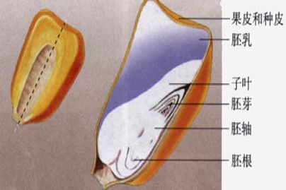 | 玉米种子 | 有胚乳,营养物质贮藏在胚乳里。子叶一片。 |