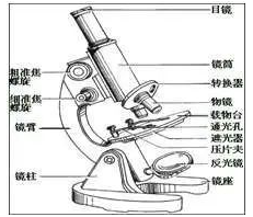 显微镜 显微镜的成像原理:(放大原理) 光线一反光镜一遮光器一通光孔一标本(要透明)一物镜(第一次放大成倒立的实像)一镜筒一目镜(再次放大成倒立的虚像)一眼 镜头长度与放大倍数的关系: (1)目镜越长放大倍数越小,成“反比”关系 (2)物镜越长放大倍数越大,成“正比”关系 物镜倍数大小 (1)在高倍物镜下,看到的视野是小而暗,细胞是大而少;而在低倍物镜下,看到的视野是大而亮,细胞是小而多。 (2)物镜放大倍数越大,物镜与玻片的距离越小;物镜放大倍数越小,物镜与玻片的距离越大。 显微镜结构 显微镜示意图名称 作用 目镜 (接近眼睛的镜头) 放大标本和成像 物镜 (接近玻片的镜头) 放大标本和成像 镜筒 上面装目镜,下面连转换器 转换器 上面装有1〜3个倍数不同的物镜,用于调换物镜 载物台 放置玻片标本的地方 通光孔 在载物台中央,使光线通过 压片夹 固定玻片标本 遮光器 上面有大小不同的光圈, 能调节光线强弱。(光线强时,调小光圈;光线弱时,调大光圈) 反光镜 反射光线,调节光线强弱。(光线强时,用平面镜;光线弱时,用凹面镜) 粗准焦螺旋 调节焦距,转动时,镜筒升降的幅度大, 细准焦螺旋 调节焦距,转动时,镜筒升降的幅度小 镜臂 提握显微镜的部位 镜柱 支持镜身 镜座 稳定镜身