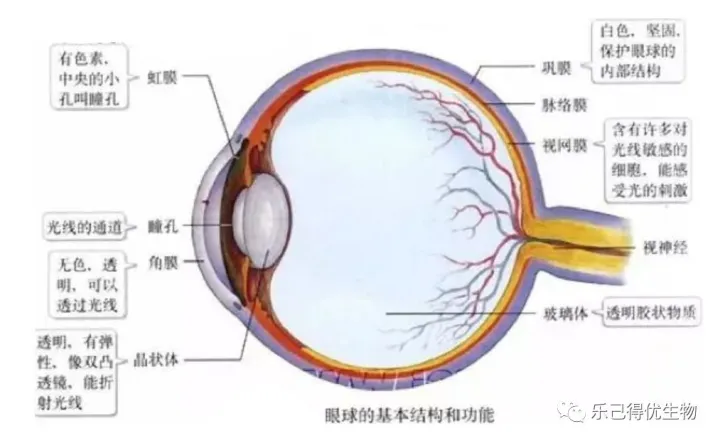 与视觉形成有关的主要结构是:角膜、虹膜、晶状体、玻璃体、视网膜。
