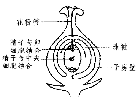 绿色开花植物特有的受精方式为双受精,即一个精子与卵细胞融合形成受精卵,另一个精子与中央细胞融合。