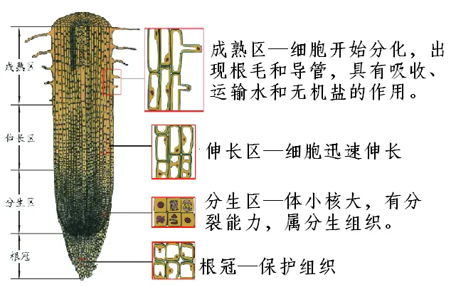 成熟区开始分化形成根毛和导管,具有吸收、运输水和无机盐的作用。