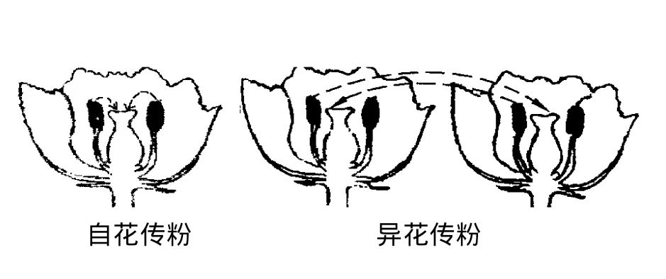 (3)传粉:花粉落到柱头上的过程。包括自花传粉和异花传粉两种方式。见右图。