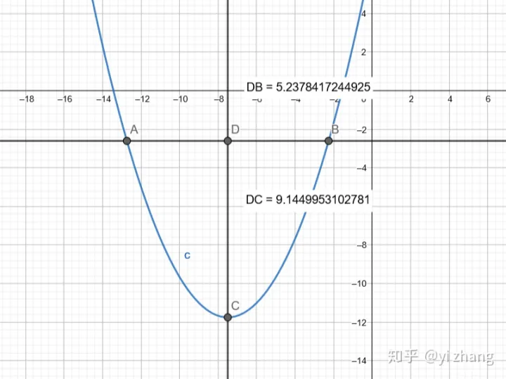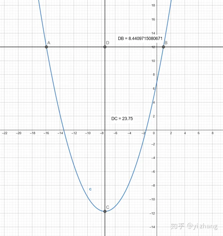 显然任意一个根到对称轴的距离为 ,因为抛物线任意平移形状不变。也就是我可以将任意抛物线平移后得到形如 ,例如 ,