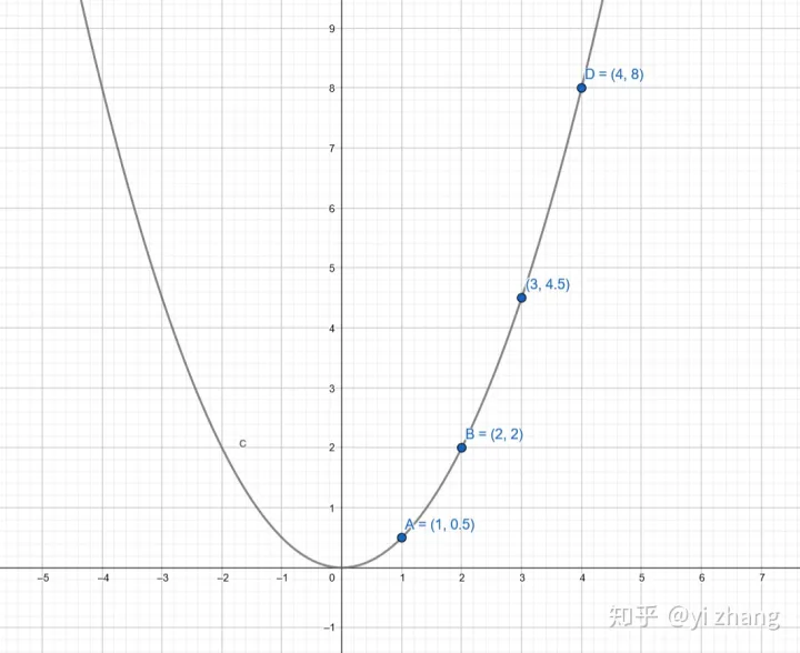 横纵坐标保持着,纵坐标=1/2*横坐标的平方关系