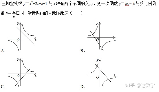 这类题目属于定性分析题,不要你实实在在算出具体数字的题目。但是要做对,也是需要你对反比例函数定义以及抛物线定义有所了解。这题不是单纯只考反比例函数内容还结合了抛物线知识。属于双线结合题。出题遵循先易后难,放在例题1,说明难度不大。抛物线有两个不同交点,说明▲=b²-4ac>0可以得到。计算出K<0反比例过二、四象限。直接排除A、C两个选项。接下来y=kx-k说明这个函数必过(1、0)点所以直接选D选项。如何理解必过(1.0)点,这个知识点经常考。y=kx-k=k(x-1) 当x取1时,无论K为何值。y必然为0 所以必过(1.0)点。
