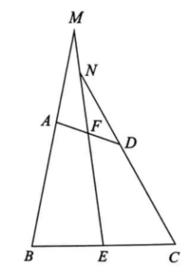 例. 在四边形ABCD中,AB=CD,E、F分别是BC、AD的中点,连接EF并延长,分别与BA、CD的延长线交于点M、N。求证:∠BME=∠CNE。