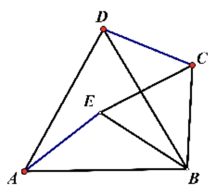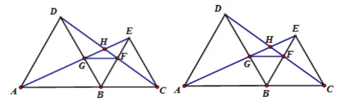 例1、在直线ABC的同一侧作两个等边三角形△ABD和△BCE,连接AE与CD,证明: