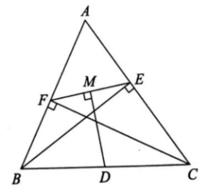 例. 如图,在△ABC中,BE、CF分别为AC、AB上的高,D为BC的中点,DM⊥EF于点M。求证:FM=EM。