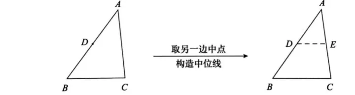 在三角形中,如果有中点,可构造三角形的中位线,利用三角形中位线的性质定理:DE∥BC,且DE=1/2BC来解题。中位线定理中既有线段之间的位置关系又有数量关系,该模型可以解决角相等,线段之间的倍半、相等及平行问题。