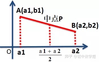 数轴(一维)上两点a,b的中点公式是(a+b)/2。平面直角坐标系(二维)上两点A(a1,b1)与B(a2,b2)的中点P的横坐标是(a1+a2)/2,纵坐标是(b1+b2)/2。参照下图来理解,点A在x轴对应a1,点B在x轴对应a2,中点P在x轴对应(a1+a2)/2,纵坐标同理。