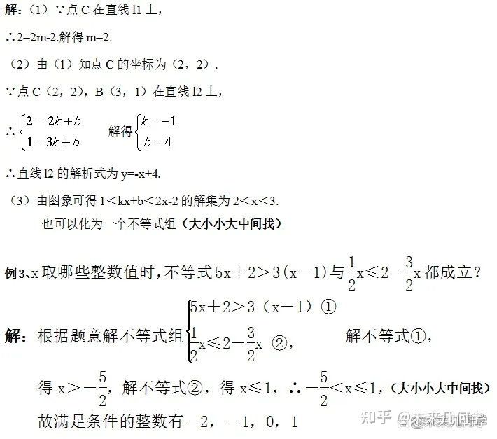 例2、如图,直线l1的解析式为y=2x-2,直线l1与x轴交于点D,直线l2:y=kx+b与x轴交于点A,且经过点B,直线l1,l2交于点C(m,2).