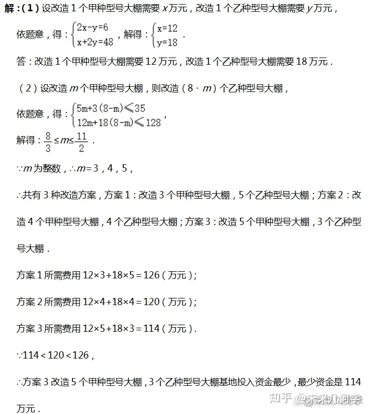 (2)已知改造1个甲种型号大棚的时间是5天,改造1个乙种型号大概的时间是3天,该基地计划改造甲、乙两种蔬菜大棚共8个,改造资金最多能投入128万元,要求改造时间不超过35天,请问有几种改造方案?哪种方案基地投入资金最少,最少是多少?
