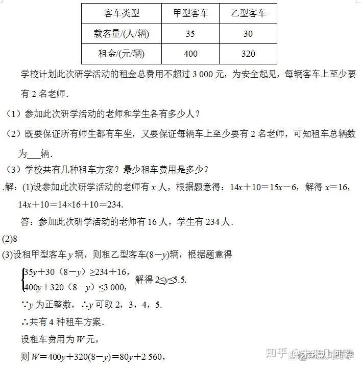 例4、为拓展学生视野,促进书本知识与生活实践的深度融合,荆州市某中学组织八年级全体学生前往松滋洈水研学基地开展研学活动.在此次活动中,若每名老师带队14名学生,则还剩10名学生没老师带;若每名老师带队15名学生,就有1名老师少带6名学生.现有甲、乙两种大型客车,它们的载客量和租金如下表所示: