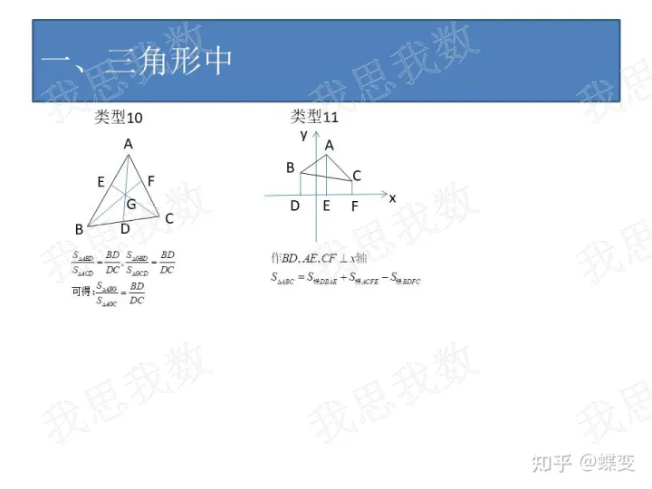 本文介绍了11种类型的三角形面积问题。其中求一个三角形的面积的思路有:1、底乘以高除以2。2、两边与夹角正弦乘积再除以2。3、分割出两个或三个三角形求面积和(见类型3、类型4)。4、利用底和高之间的关系(见类型1)。5、利用相似三角形面积比等于对应边之比的平方(类型6)。6、利用割补法求面积(类型11)。