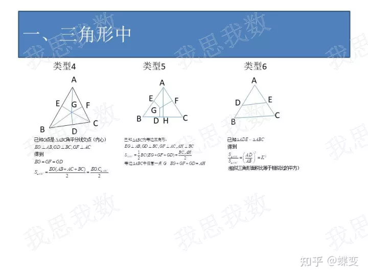 利用面积法可以得到以下结论:1、角平分线分割的两个三角形面积之比等于底边之比,侧边之比。2、底在一条边上,高相同的两个三角形面积比等于底边之比。3、等腰三角形底边上一点到两腰距离和为定值。4、等边三角形内任一点到三边距离之和为定值。5、有一个角相等或互补的两个三角形,面积之比等于该角夹边的乘积之比。