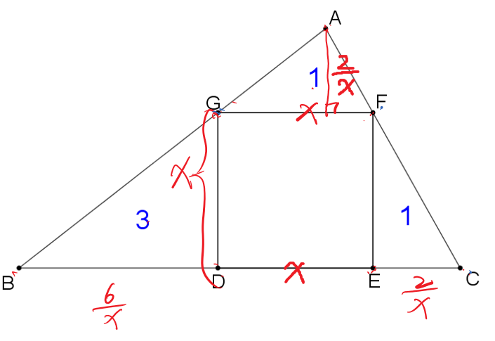 分析:按照常规思路,把正方形边长设为x,利用△AGF∽△ABC,高之比等于边长之比,构建关于x的方程解出x的值。