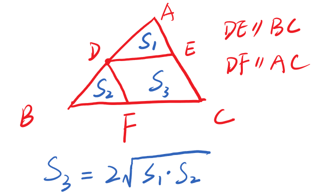 现在讲解一下秒杀方法,对于三角形内接平行四边形问题,平行线分割成的三部分面积有一个等量关系。