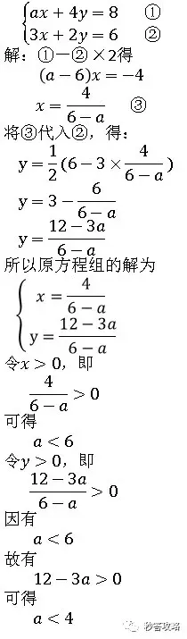 这是一个典型的含参二元一次方程的解的问题,根据常规思路,先解方程,得到含有参数a的方程的解,然后另对应的x、y大于零,求解a的范围即可。