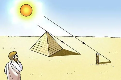 那时候,人们建造了高大的金字塔,可是谁也不知道金字塔究竟有多高。有人说:“要想测量金字塔的高度,比登天还难!”这话传到欧几里得耳朵里。他笑着告诉别人:“这有什么难的呢?当你的影子跟你的身体一样长的时候,你去量一下金字塔的影子有多长,那长度便等于金字塔的高度!”