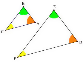 三个对应的内角的角度都一样(但边长大小不需一样)的两个三角形,或:对应角相等,对应边成比例的两个三角形称为“相似三角形(similar triangles)”,其对应边之比称为相似比;两个相似比为1的相似三角形称为全等三角形。