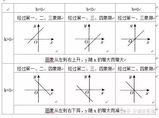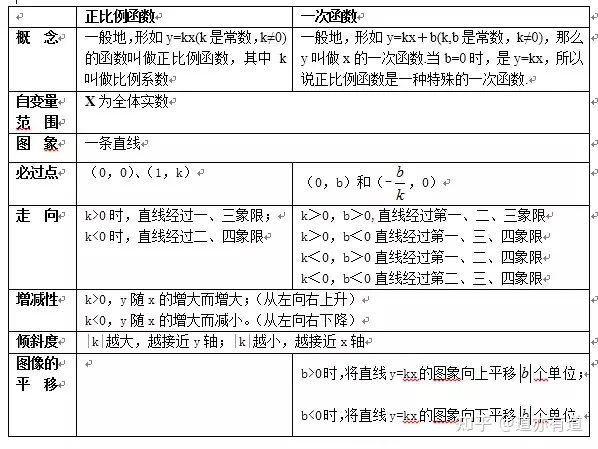 5、正比例函数与一次函数之间的关系:一次函数y=kx+b的图象是一条直线,它可以看作是由直线y=kx平移|b|个单位长度而得到(当b>0时,向上平移;当b<0时,向下平移)