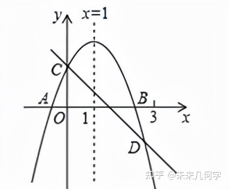 ∵直线y=−x+c与抛物线y=ax2+bx+c交于C、D两点,D点在x轴下方且横坐标小于3,