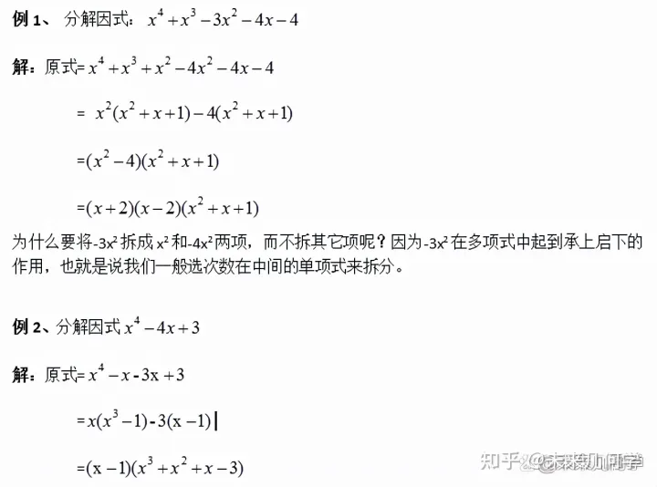 以上就是因式分解拆项法和添项法的使用技巧。不过,只有我们认真掌握了因式分解的四种基本方法:提公因式法、公式法、十字相乘法、配方法,然后再结合拆项法和添项法灵活应用,才能有的放矢,融会贯通。