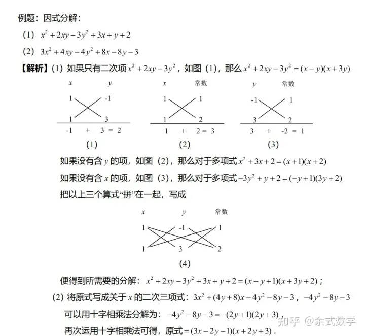 双十字相乘法的本质与十字相乘法是一致的,它一般适用于二次六项式(二元二次六项式或三元二次六项齐次式),形如:
