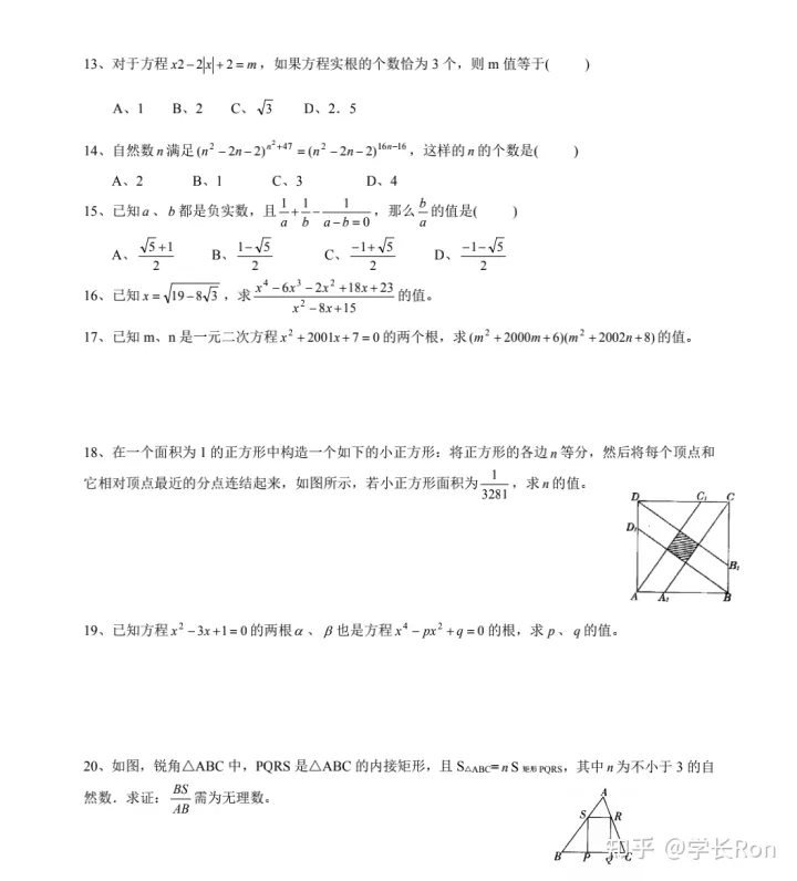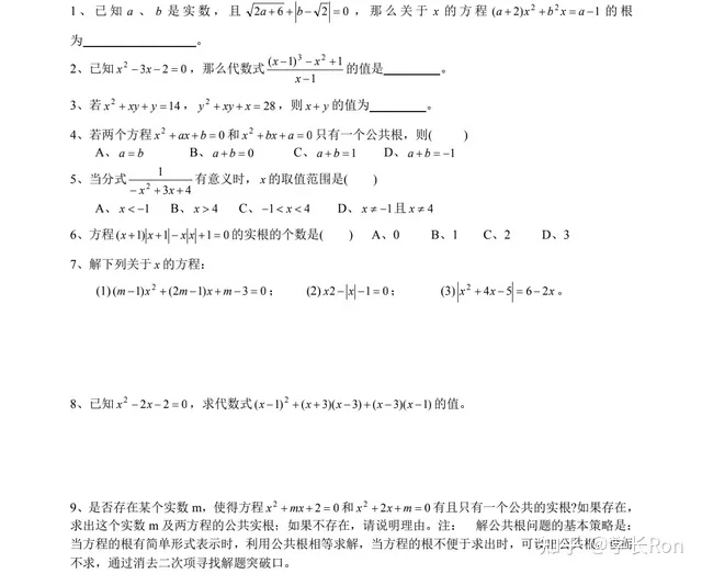 为什么这么说?因为,有些题目中的条件,用公式法运算量很大,甚至在解题过程中,会出现不合理的结果。所以,我们就要想办法去做一些变形、代换的处理。常用到的降次转化的方法有:变形降次、整体代入、构造零值多项式等。
