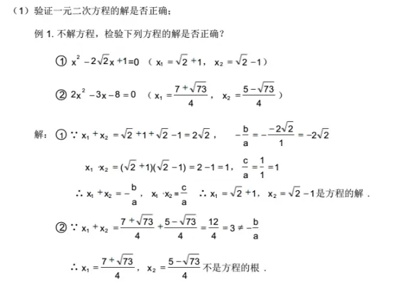 1.定理:设一元二次方程ax2+bx+c=0(a≠0且b2−4ac≥0)的两个根分别为x1和x2,则:x1+x2=-b/a,x1·x2=c/a