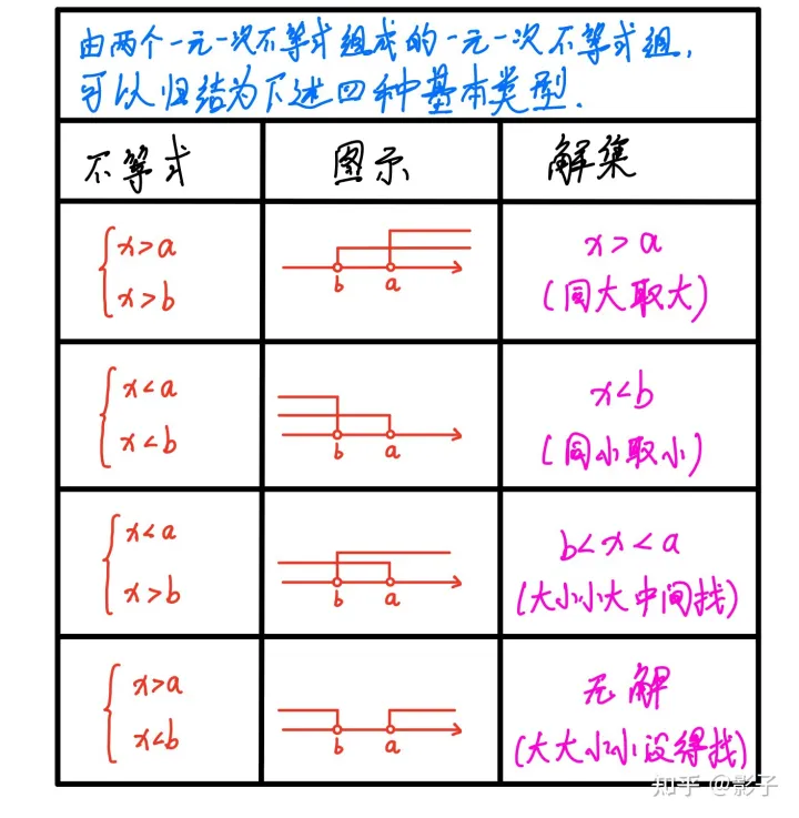 这里需要注意,在数轴上我们找的是双横线重合的部分。口诀中的“大小小大”其实就是“大于比较小的数,小于比较大的数”;“大大小小”是“大于比较大的数,小于比较小的数”.