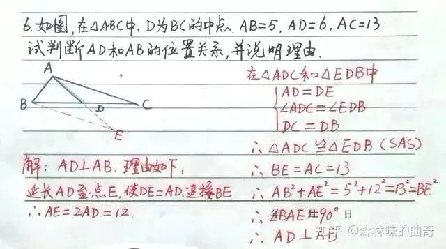 第6题,就是我们最常见的倍长中线法,构造三角形全等。这个倍长中线的辅助线添加方法,在很多的题型中,都用得到。
