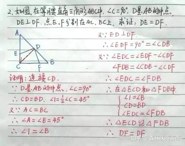 第2题,等腰直角三角形,斜边上的中点,一般连接斜边的中线,得到三条边相等,得几个45°角相等。