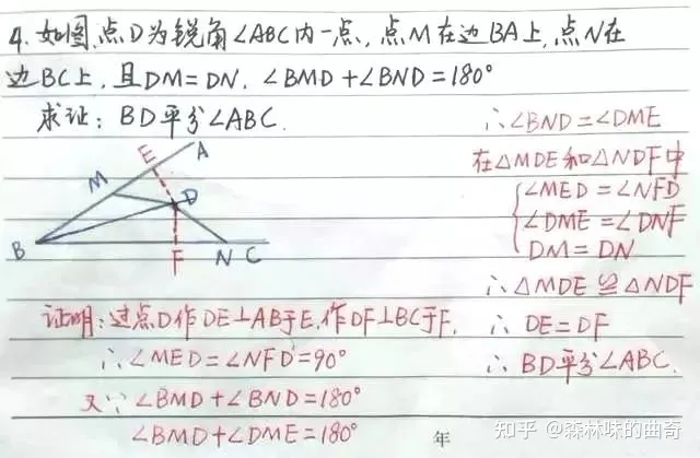 第4题,要求证明BD平分∠ABC,第一想到的是角平分线的性质的逆定理。过点D做角两边的垂线,构造两个三角形全等,得到点到角两边的距离相等。