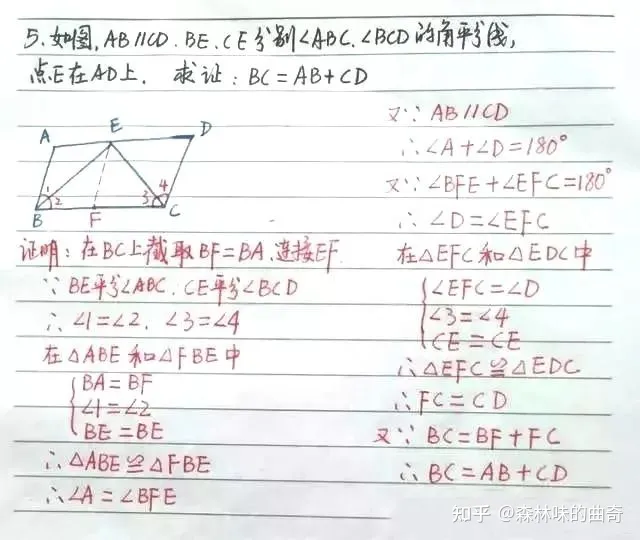 第5题,这类证明一条线段等于几条线段之和的题型,就是想办法添加辅助线,进行相等的线段进行代换,把几条线段放到一条线段上。那么线段相等,一般就是需要构造三角形全等。