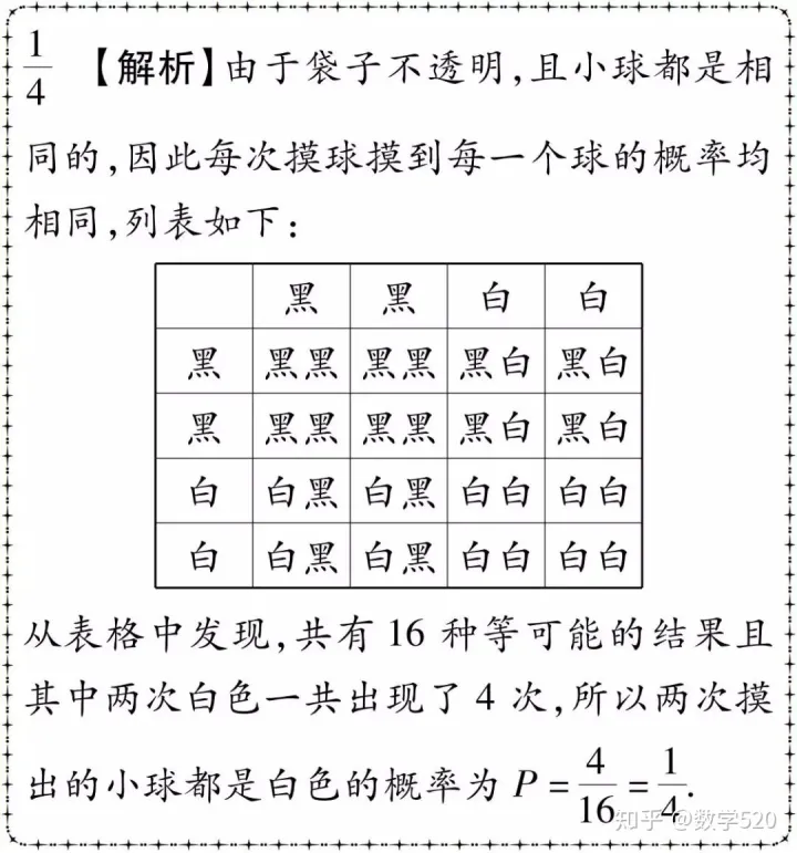例1 一个不透明的袋子中装有黑、白小球各两个,这些小球除颜色外无其他差别,从袋子中随机摸出一个小球后,放回并摇匀,再随机摸出一个小球,则两次摸出的小球都是白球的概率为____.
