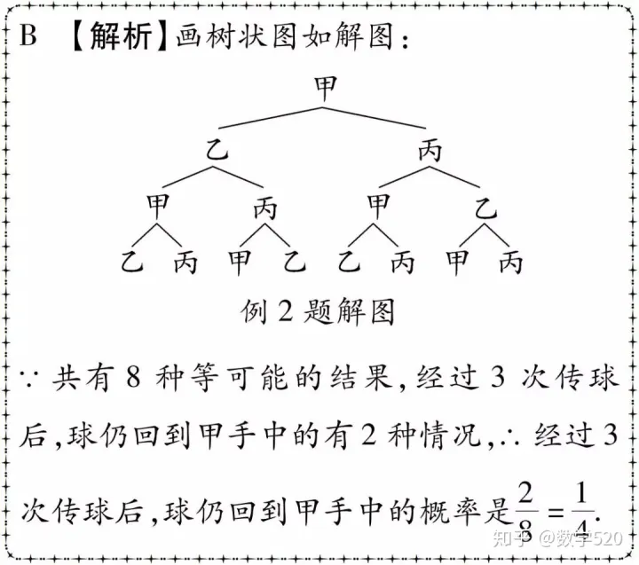 例2 在排球训练中,甲、乙、丙三人相互传球,由甲开始发球(记作为第一次传球),则经过三次传球后,球仍回到甲手中的概率是()