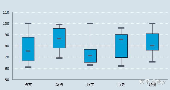如上图,数学箱线图里我们可以看出这个班级数学最高分有100,最低分63左右,历史最高分不到100,最低分低于数学。但是我们能说历史的成绩要不如数学吗?数学的箱体偏下,中位数居中,说明数学虽然有100的学霸,但优秀者凤毛麟角,一半人还是处于80到60 之间。而历史成绩,则在98到62范围内更均匀,而且中位数88左右在箱体偏上部分,说明有一半人在88以上,88到90的人有四分之一。同理对于地理来说虽然中间部分集中情况优于数学,但是四分之一的人集中在76到80,明显不见得比历史好。