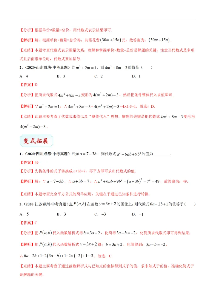 2023年初中数学代数式及整式的加减