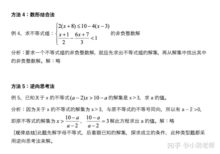 (2)解法:与解一元一次方程类似,但要特别注意当不等式的两边同乘以(或除以)一个负数时,不等号方向要改变。