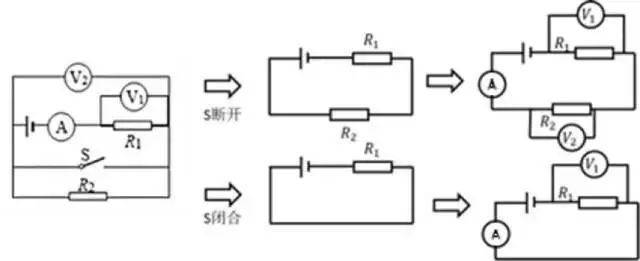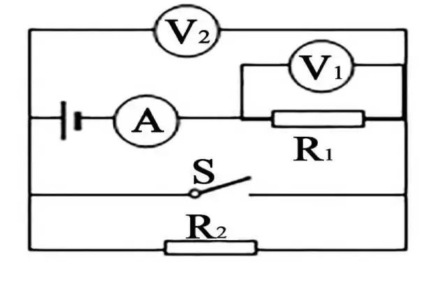 C选项,开关S断开时,电压表V2测的是R2两端的电压,示数大于零,开关S闭合后,电压表V2测的是导线两端电压,电压表示数变为零,所以电压表V2示数减小,故C错误。