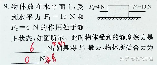 当物体受到了如图所示的两个水平力时,由于其处于静止状态,因此受力平衡,很显然要受到向右的6N的静摩擦力才能平衡。也就是说此时虽受到了两个力,但是由于二力不等大,因此相当于受到了一个水平向右的6N的推力!当我们把水平向左的10N的力撤去后,只剩下4N的水平推力,由于刚才6N的推力都只能使物体处于静止状态,4N的推力更不可能推动物体,因此此时物体依然处于静止状态,所以所受到的合力为零!