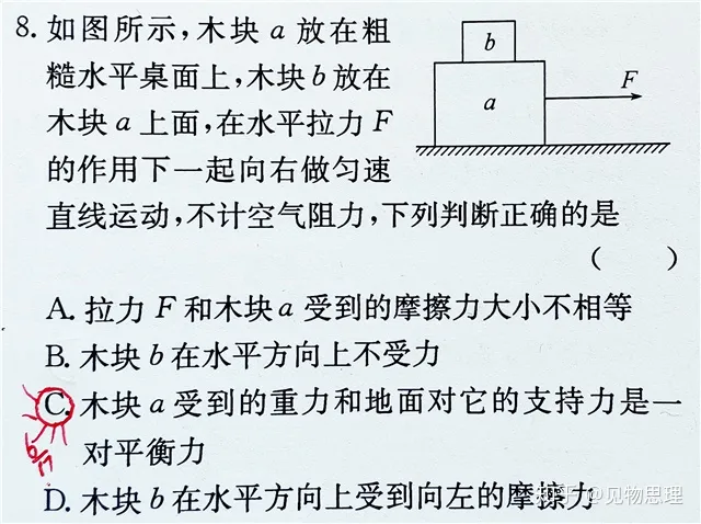 此题有将近一半的学生错选了C选项,我们可以对这两个物体受力分析一下,由于二者一起向右做匀速直线运动,所以这两个物体都是受力平衡的,对木块a,在竖直方向上,会受到竖直向下的重力,还有b物体对它向下的压力,以及桌面对它的支持力。也就是说a在竖直方向上三力平衡!很显然其重力与地面对它的支持力不是一对平衡力,地面对它的支持力是大于它的重力的。