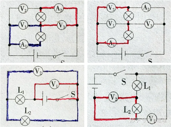 另外,有些电路看上去比较复杂,我们可以进行如下处理,会比较容易识别:如要考虑电流表的测量对象,可先将电压表全部去掉(因为它们相当于断路);如要考虑某一电压表的测量对象,可只保留需要考虑的那只电压表,其余的电压表(如果电路中有二只以上电压表的话)也去掉,所有电流表用导线代替,另画一张电路图来观察。