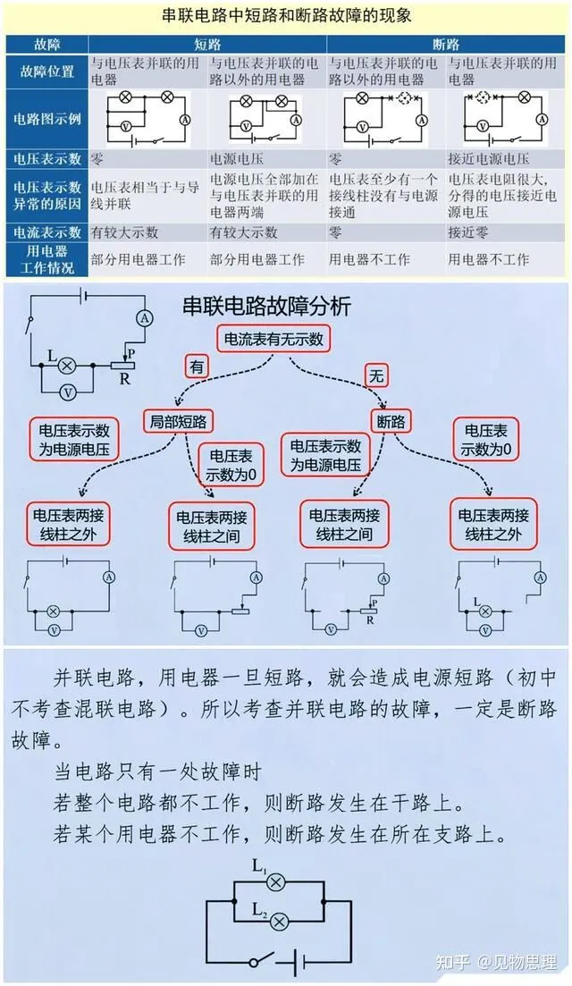 按照以下思路,我们可以发现,通过电流表有无示数,就可以判断出电路的故障种类;通过电压表有无示数,可以判断出电路的故障位置!